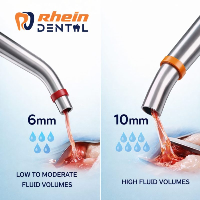 Suction tips are designed to evacuate fluids such as blood, saliva, irrigation solutions, and debris. The diameter of the tip directly affects (Suction tip diameter selection):
